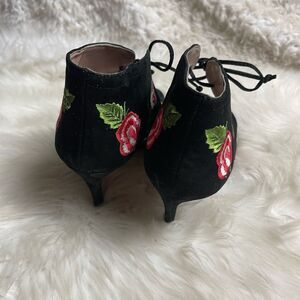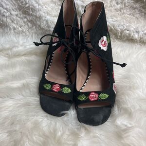 Betsey Johnson synthetic suede black lace up ankle heels open toe with embroidery floral SZ8.5 . Pre owned in good used condition signs of wear on the outer soles see all pictures any questions please message.E9