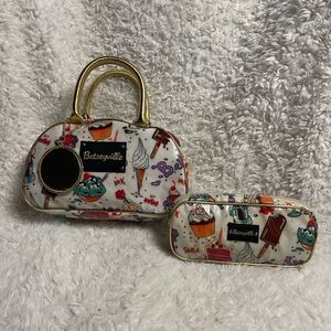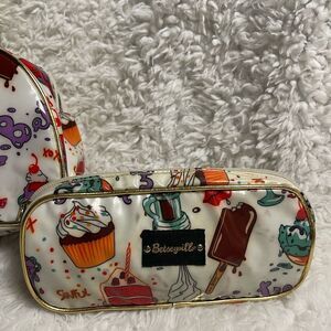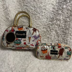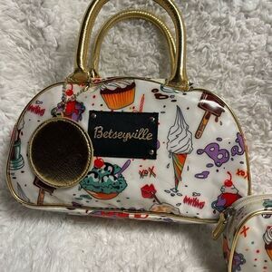 Betsey Johnson Betseyville vinyl white satchel with multi color ice cream print bonus cosmetic wallet gold tone trim and straps ..top zipper the inside lining has a side zipper. Pre owned in good used condition normal wear see all pictures. Any questions please message.k