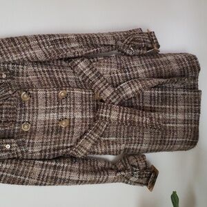 Betsey Johnson wool blend neutral boucle plaid midi double breasted coat with tie, big buttons, pockets, collar, has snaps for hood but no hood included. women's size 2. Great condition.