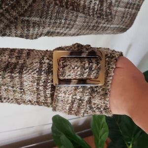 Betsey Johnson wool blend neutral boucle plaid midi double breasted coat w/ tie