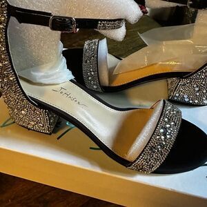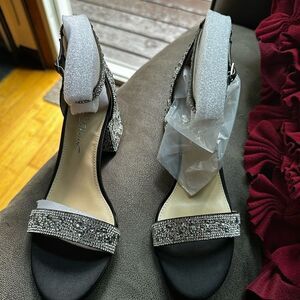 Elevate your style with Betsey Johnson's stunning black and silver heels, featuring a chic block heel and a minimalist ankle strap design. These glamorous shoes are perfect for formal occasions, offering a blend of elegance and comfort with their glittery finish and moderate heel height.