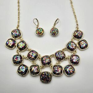 This stunning Betsey Johnson and Liz Claiborne set features a rainbow sparkle bib necklace and matching earrings. The gold tone adds elegance and charm, making it perfect for any occasion.
