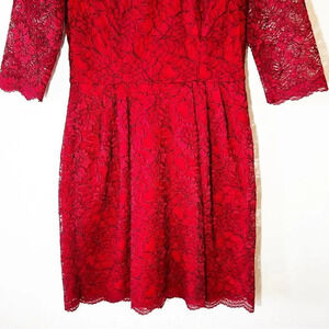Betsey Johnson red lace dress size 8. Illusion neckline with 3/4 sleeves. Nylon and poly blend. Back zip and button loop. So cute for Christmas! Preowned.