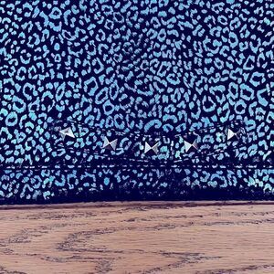 Metallic teal and black leopard print envelope clutch with removable chain, and studded handle. 15” x 8”x 15”