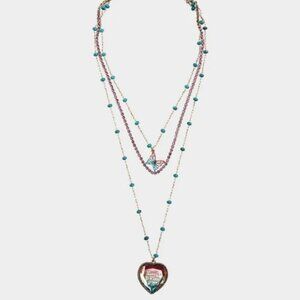 Charming 3-chain charm-type necklace. Ombre mirrored pendant from Betsey Johnson's "Love Flies Free" Collection. The same is engraved on the heart pendant. Faux Turquoise beads along the chains. Very pretty & sparkly light pink tennis chain Y2K inspired. Lovely mix of vibrant colors.