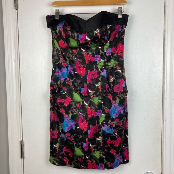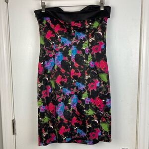 Betsey Johnson Black Pink Blue Green Abstract Floral Sweetheart Strapless Mini Dress Sleeveless Retro Artsy