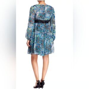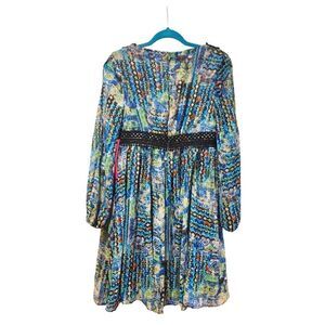 New with Tags | Betsey Johnson Crochet Trim Printed Gypsy Dresses, Turquoise & Black Boho | 6 | MSRP $138 | Split Sleeve Detail along the Longsleeve | Lined | Hidden Zipper Closure in Back | 100٪ Polyester | Dry Clean | Measurements Laying Flat and Unstretched: Pit to pit 16" | Waist 14.5" | Length 34" | Sleeve Length 23"