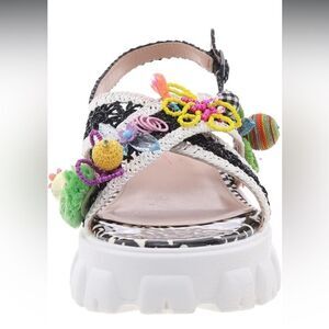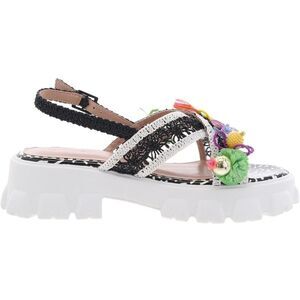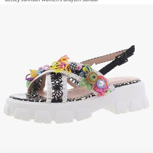 These Betsey Johnson sandals feature a vibrant floral print on a fabric upper, paired with a chunky white platform sole for a bold, fashion-forward look. The cleated bottom design adds a sporty touch, while the adjustable slingback strap ensures a comfortable fit. Perfect for making a statement, these sandals combine playful patterns with a modern silhouette.