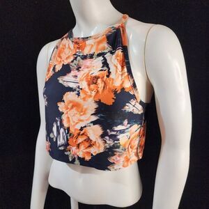 Betsey Johnson black and orange floral patterned high neck cross back yoga crop top with built-in shelf bra.
