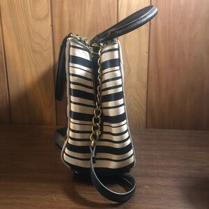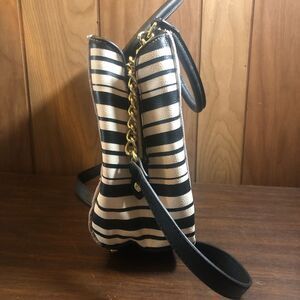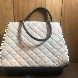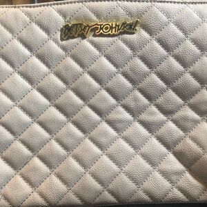 This Betsey Johnson satchel features a luxurious quilted design in a sophisticated gray and black color scheme. The structured shape and durable materials ensure it maintains its form, while the shoulder strap offers versatile carrying options. Gold-toned hardware and edgy studded details add a touch of glamour to this stylish accessory. Floral interior. Multiple pockets inside.