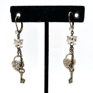 Betsey Johnson Heart &Key Charm Drop Earrings Silvertone and Rhinestone