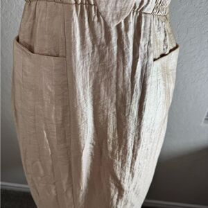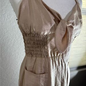 No notable flaws. Will need to be steamed or dry cleaned. Elegant beige halter dress with a tie front and smocked waist. Perfect for casual outings or summer events. STUNNING PEARL COLOURED HALTER NECK DRESS WITH BOW AT FRONT, TWO SIDE POCKETS, ZIP WITH HOOK AND EYE, RUNCHED MIDDLE AND TWO SLITS AT THE SIDES AT THE BOTTOM OF DRESS