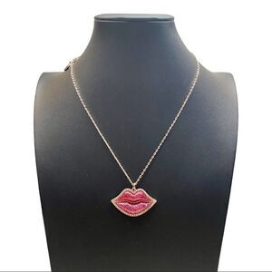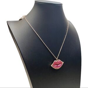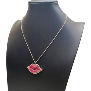 Betsey Johnson Sparkly Lips Pendant on Bright Gold Toned Chain. Dk. Pink/Purple.