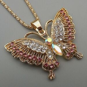 🦋 Betsey Johnson stunning Fashion Pink Clear Crystal Butterfly Insect Pendant Sweater Necklace. Gorgeous sparkle makes this beautiful butterfly pop. Very attractive goldtone glistening chain 27 inches adjustable 🦋