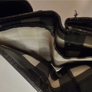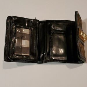 This wallet measures about 5" x 4 1/2" when folded. It is pre-owned and shows wear and has some marks on inside from usage.