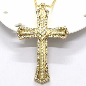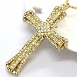 Gorgeous champagne gold cross with beautiful iridescent stones adorning the whole piece. Comes with a long fancy chain with a lobster claw clasp and a tiny heart charm at the end. Just a beautiful piece. Chain is 22 inches and has extension, lobster claw clasp and signed heart charm at the end. Cross is 3 inches.