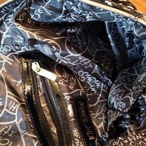 Great satchel from the iconic designer. Big patent bow on the front with a pink heart. Outside patent handles. Removable shoulder strap. Top zip with heart shaped pull. There is a flaw in the zipper, but it ZIPS. Inside a satiny signature lining with Betsey graffiti. One zip and two slip pockets. 12 wide 4.5 deep, 9 high. 6 inch drop from short handles, 13 inch drop from long handles as shown, can get longer. Love, Betsey.