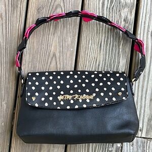 Black flap bag with with dots, black and pink hearts strap, key strap, inside pockets