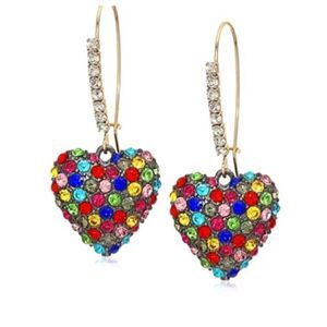 💙 Betsey Johnson stunning earrings. Drop dangle Shepard hook embellished with crystals & decorated with a beautiful multicolored crystal hearts. Beautiful colors & sparkle with a vintage style 💙