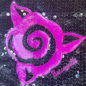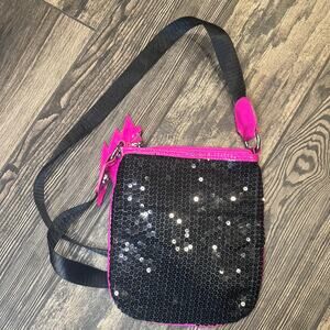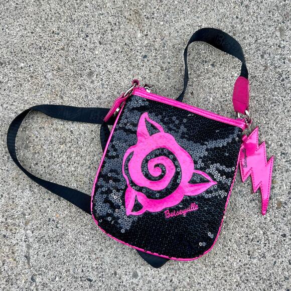 Black sequins with hot pink painted flower discontinued Betseyville crossbody bag. Hot pink lightning bolt accent. In good used condition. Slight cracking beginning on the painted flower.