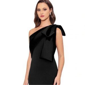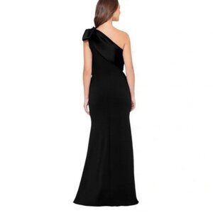 Betsy & Adam Black Bow One-Shoulder Crepe Mermaid Gown