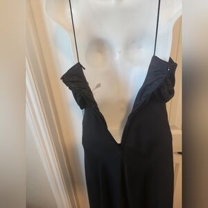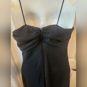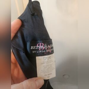 This stunning black gown by Betsy & Adam is perfect for a cocktail night out. Featuring a sophisticated cowl neck and delicate spaghetti straps, this sleeveless dress exudes elegance and style. Its sleek silhouette and smooth fabric make it a timeless choice for any special occasion.