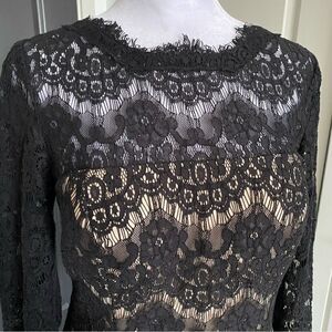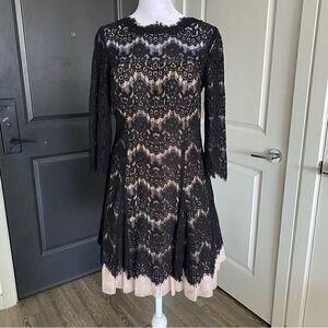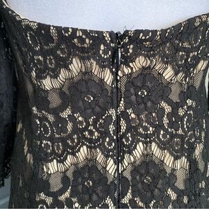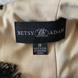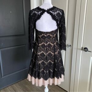 This dress is timeless and chic, very Breakfast At Tiffany’s! By the popular formalwear brand Betsy & Adam, this cocktail dress features a gorgeous black lace overlay with nude lining and tulle skirt for volume, molded cups for support, large keyhole openings at the back with hidden zipper closure. Excellent condition and ready for your next special occasion!