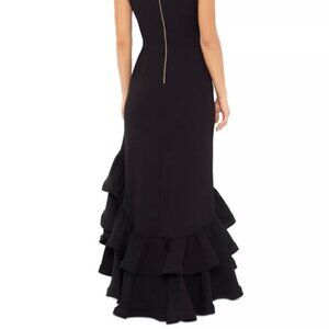 Betsy & Adam Black Ruffle Halter Crepe Gown
