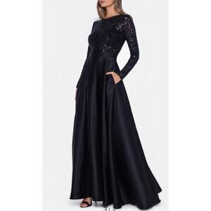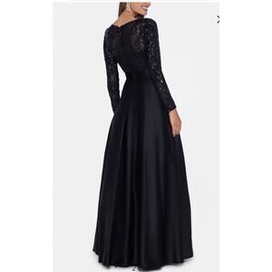 Make a grand entrance in this stunning Betsy & Adam ballgown! This elegant dress features a sequin-adorned illusion bodice and a contrasting black skirt. Perfect for your next formal event!