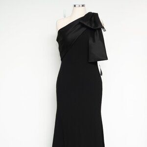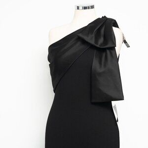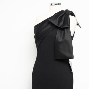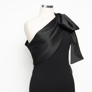 This “Carmela” gown is cut from sleek scuba crepe for a smooth, sculpted silhouette, designed with a one-shoulder neckline topped by a dramatic satin bow for just the right touch of glamour. Fully lined for comfort and finished with a hidden back zipper, it’s a timeless piece that pairs modern structure with a soft, fluid drape. The floor-length cut is fully lined and finished with a hidden back zipper for a clean fit. A timeless piece that feels elegant yet understated—perfect for weddings, galas, or formal evening events.