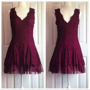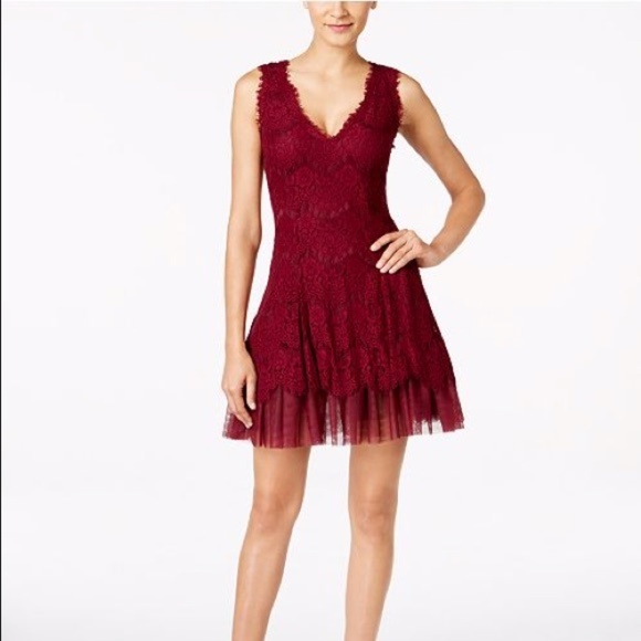 Fun, flirty and flattering?. It's the trifecta of party dresses. Worn only once for a total of 3 hours. The mini silhouette and rich wine color are super forgiving and help add an hourglass shape. Intricate lace overlay with intentional frayed edges. Fully lined underneath with tulle A-line skirt. V-neck sleeveless fit & flare dress has bra pads. No bra necessary! Back Zipper. Move over LBD. All eyes will be on you in this party outfit. Stock photo shows fit, not color, on model.