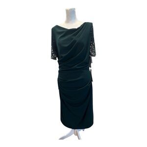 The Betsy & Adam Dress in size 8 features a solid green color with a draped loose cowl neck and short flutter sleeves with beads making it suitable for various occasions such as weddings, parties, formal events, and business functions. The dress is made of polyester and spandex, providing a comfortable and stretchy fit. It is accented with beads and sequins, adding a touch of elegance to the pencil dress style. The midi length dress is lined and designed with ruched details, perfect for year-round wear in all seasons. Made in the United States, this dress exudes sophistication and style.