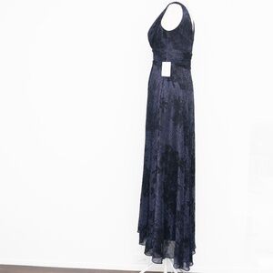 Shimmering with a metallic floral crinkle overlay, this Betsy & Adam gown blends elegance with a touch of sparkle. Designed with a deep V-neck and matching V-back, it’s cut in a flowy silhouette that moves beautifully with every step, while the hidden back zip ensures a smooth fit. Side-seam pockets bring a hint of modern practicality, making it as functional as it is striking. Fully lined for comfort, this sleeveless style is crafted from a luxe blend of polyester and metallic fibers, offering structure with lightweight movement. Perfect for formal evenings, weddings, and special events, it’s a gown that stands out while remaining timeless in design.