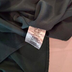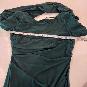 Size 10 Betsy & Adam Green Draped Back Cowl Neck Gown. 95% polyester 5% spandex. High boat neckline. Gown silhouette. Back zipper closure. V-back; draped detail off the sleeves and around back. Pit to pit 17”. Approximate length 60” Very good pre-owned condition.