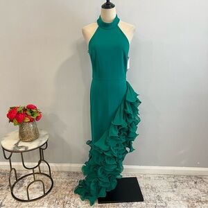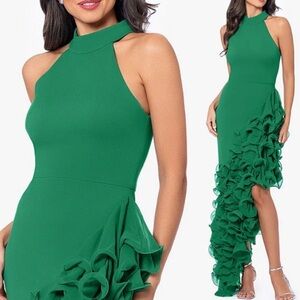 Betsy & Adam Green Halter Neck Sleeveless Asymmetrical Body Con Side Ruffle Gown