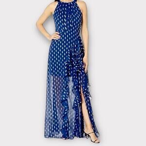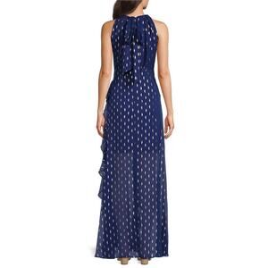 Betsy & Adam Karina Chiffon Foil Ruffle Halter Tie Evening Dress Blue Size 18W