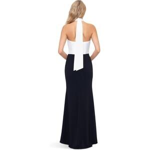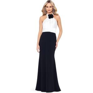 Betsy & Adam Long scuba crepe gown with flower - Women's Dress : Black/White : Exude graceful vibes and turn heads around as you step into the party wearing Betsy Adam Long scuba crepe gown with flower. The gown comes in a scuba crepe fabrication and features a halter neck with attractive flower motif, sleeveless design, back-tie closure, back zipper closure, and a floor-length silhouette. ; Lined. ; 94% polyester, 6% spandex. ; Dry clean only. ; Imported.