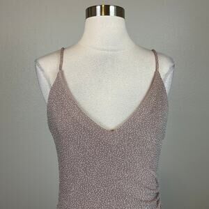 ~ Sleeveless ~ V-neckline ~ Spaghetti shoulder straps ~ Center slit ~ Ruched at side ~ Split skirt ~ Long, at the floor hemline ~ Stretchy knit fabric in a taupe/purple/brown color with flecks of white throughout ~ Strapless-bra-friendly ~ Concealed back zipper with hook and eye closure ~ Fully lined ~ Stretchy nylon/metallic/polyester