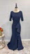 Betsy & Adam Navy Blue 1/2 Sleeve Pleat & Ruffle Detail V Back Maxi Mermaid Gown