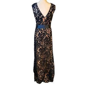 Make a statement at your next special event with this elegant Betsy & Adam evening gown. The dress features beautiful navy blue lace over a taupe lining, creating a sophisticated and timeless look. The self-tie sash cinches the waist for a flattering silhouette, while the v-back and slight mermaid styling add a touch of drama. Perfect for a black-tie affair, this gown is sure to turn heads.