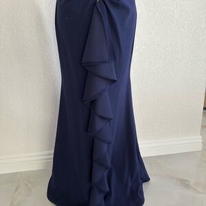 Elegant and timeless, this floor-length Betsy & Adam gown is crafted in a rich navy blue. The dress features a dramatic off-the-shoulder fold-over neckline and a sleek, figure-flattering silhouette. The back showcases an exposed gold zipper and a cascading ruffle detail that flows into a subtle mermaid-style hem for added movement. Perfect for formal occasions, weddings, galas, or evening events.
