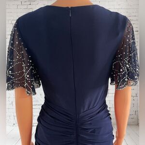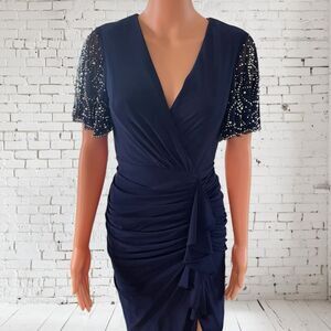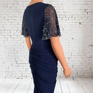 Chic navy midi dress by Betsy & Adam. Features embellished short sleeves. Elegant ruched design with front slit. Ideal for special events.