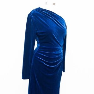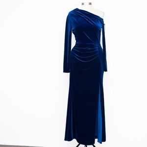 Betsy & Adam – One-Shoulder Velvet Evening Gown in rich sapphire velvet, designed with a sleek one-shoulder neckline and long sleeve for a touch of asymmetrical elegance. Soft ruching at the waist creates a flattering drape that flows into a floor-length skirt with a side slit for easy movement. Fully lined with a hint of stretch, this gown offers both comfort and sophistication—perfect for winter weddings, holiday parties, or any formal occasion. 90% polyester, 10% spandex; hidden back zip closure.