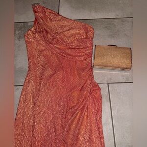 Betsy & Adam One Shoulder Metallic Ruched Gown Dress Red Orange Gold Size 6