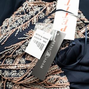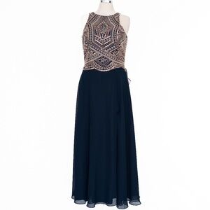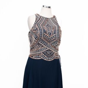 This Betsy & Adam petite gown features an intricately beaded bodice in mixed metallic tones with subtle Art Deco-inspired detailing, paired with a navy chiffon skirt that falls to a clean, floor-length drape. The round neckline and sleeveless silhouette keep the design streamlined, while the full lining and back zip closure maintain a smooth, comfortable fit. A formal style suited for weddings, galas, and evening events. Note: delicate beading may show minor wear from try-on or handling.