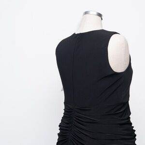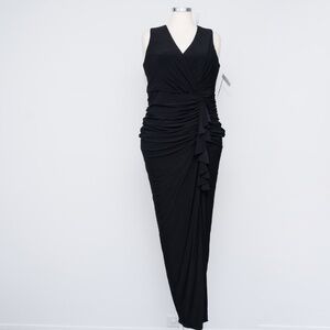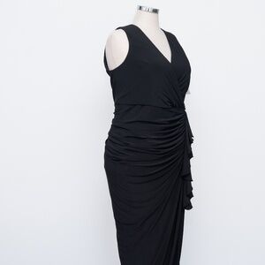 Betsy & Adam – Plus “Bobbi” Long Ruffled V-Neck Gown, a sleek black floor-length design that offers timeless elegance for special occasions. This gown features a plunging V-neckline and flattering ruching at the waist, drawing the eye to the natural curves while creating a smooth and polished fit. A cascading ruffle flows gracefully down the side, opening into a refined leg slit that adds ease of movement and a sophisticated finish. Completed with a secure back zipper closure, this piece is both comfortable and refined, making it an ideal choice for black-tie weddings, galas, or any evening event where a classic and elegant look is desired