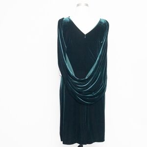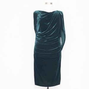 Crafted from rich hunter green stretch velvet, this luxe plus-size sheath dress features elegant cape-style draped sleeves, subtle ruching across the bodice, and a sleek knee-length silhouette. The back reveals a flattering V-shaped open drape with a concealed zipper and small slit at the hem. Fully lined for a smooth fit, it’s perfect for formal events, winter weddings, or holiday parties.