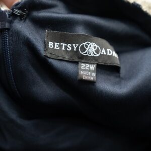 Turn heads in this Betsy & Adam Plus Foil Printed Mesh Gown, a timeless design that glimmers under the light with its metallic foil finish. The double V-neckline and long pleated-cuff sleeves add a refined touch, while the softly pleated empire waist defines the figure before falling into a flowing, floor-length sheath silhouette. Crafted from slightly stretchy mesh for comfort and movement, it’s fully lined and finished with a concealed back zipper. A beautiful choice for formal weddings, evening receptions, or holiday galas.