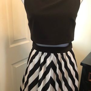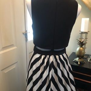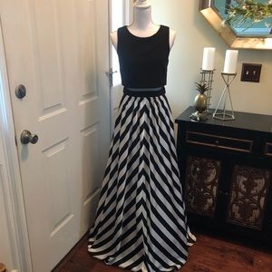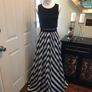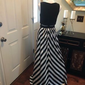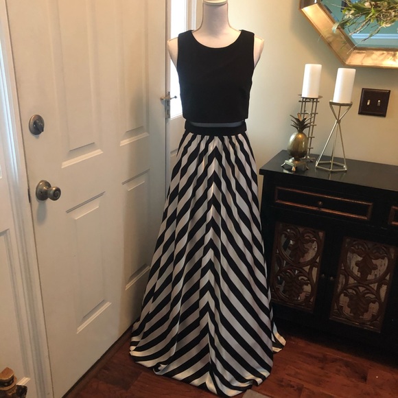 Betsy & Adam prom formal. Black sleeveless top, sheer see through black panel at waist. Black and white chevron strip skirt has tule for fullness and has pockets! This is from my home worn once for prom. See pictures for fabric details and condition.