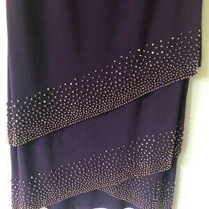 Betsy & Adam Purple Sleeveless 3 Tiered Beaded Cocktail Dress. Size 4. Slightly Hi-Lo hem. Back button closure with peephole. 95% polyester 5% spandex. Stretchy. Nice for a wedding, party or formal event. Brand new with tags!